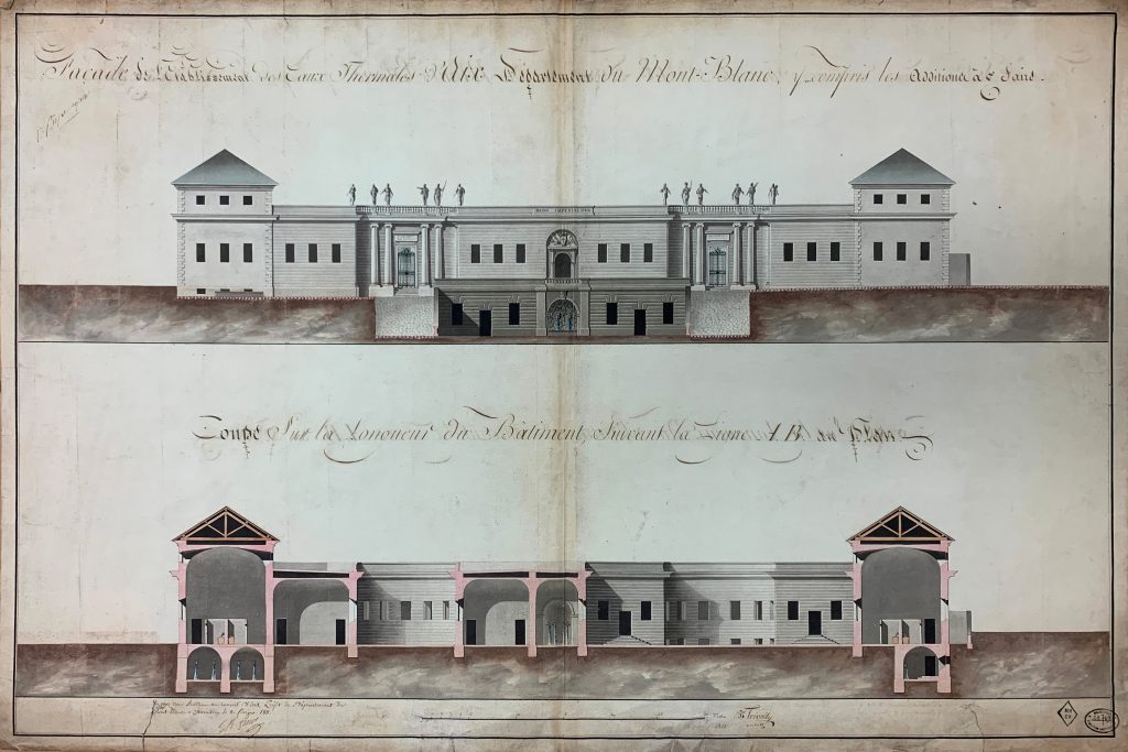 Dans différents fonds d’archives se trouvent éparpillés les pièces d’un projet de transformation du bourg d’Aix à l’époque napoléonienne. Bien que validé, ce projet très ambitieux ne verra pas le jour en raison des troubles politiques et militaires qui annoncent la chute de l’Empire. Il aura toutefois un impact sur les grands projets urbanistiques et architecturaux du XIX e siècle. Il témoigne d’un jalon important de la transformation du modeste bourg thermal du Département du Mont Blanc, alors nommé Aix en Savoie, bien